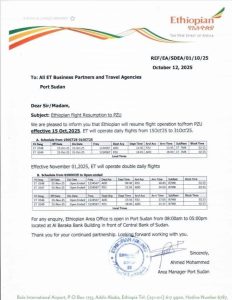 أعلنت الخطوط الجوية الإثيوبية استئناف رحلاتها من وإلى مطار بورتسودان الدولي، اعتبارًا من 15 أكتوبر 2025، برحلة يومية وحتى نهاية الشهر، على أن يرتفع العدد إلى رحلتين يومياً بدءًا من 1 نوفمبر المقبل.
