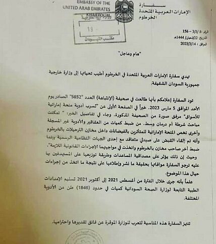 وفي 14 مارس المنصرم، أرسلت سفارة الإمارات في الخرطوم خطابا إلى وزارة الخارجية، يستفسر ما نشر في صحيفة “الانتباهة” حول حقيقة ضبطية الأدوية وطلبت إطلاعها على الإجراءات التي جرت حيال هذا الأمر الذي قالت إنه يؤثر على مصداقية المساعدات وطريقها توزيعها.