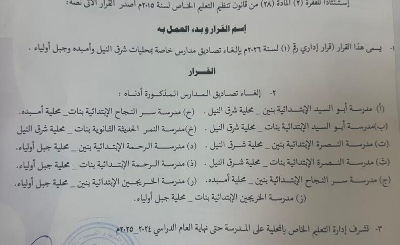 كما شمل القرار مدرستي سر النجاح بنين وبنات بمحلية أمبدة، ومدرستي الرحمة الابتدائية بنين وبنات بمحلية جبل أولياء، إلى جانب مدرستي الخريجين بنين وبنات بالمحلية نفسها.