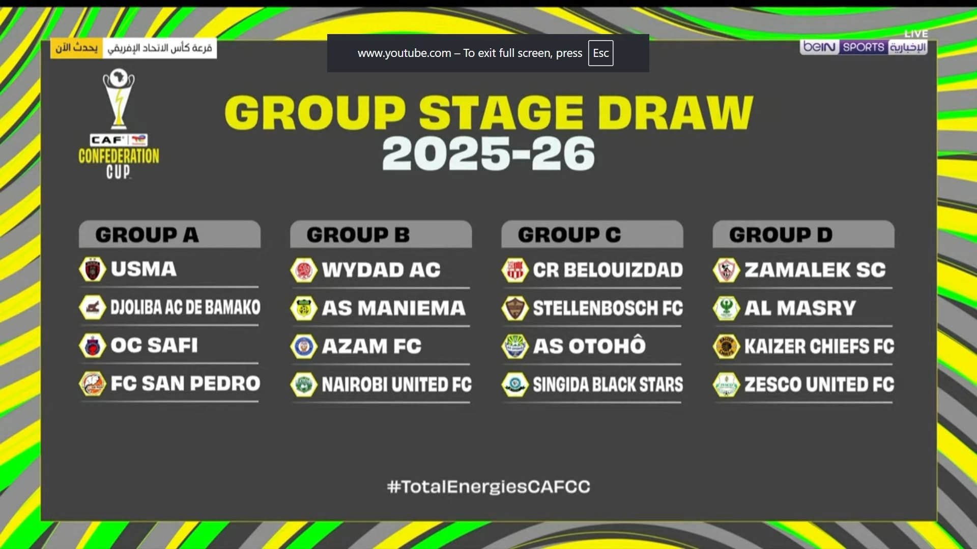 أُجريت اليوم الاثنين 3 نوفمبر 2025 مراسم قرعة دور المجموعات لبطولة كأس الكونفيدرالية الإفريقية (TotalEnergies CAF Confederation Cup) في العاصمة الجنوب إفريقية جوهانسبرغ، وسط حضور عدد من أساطير القارة أبرزهم النجم الكاميروني ألكسندر سونغ والكونغولي كاتمبو.