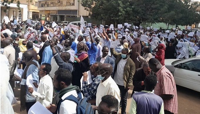 ورفع المعلمون لافتات تُطالب بدفع استحقاقاتهم، كما رددوا هتافات من قبيل: “حقنا كامل ما بنجامل” و”صحة وتعليم مجان والشعب يعيش في أمان” و”تعليم مجاني لكل سوداني”.