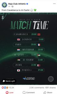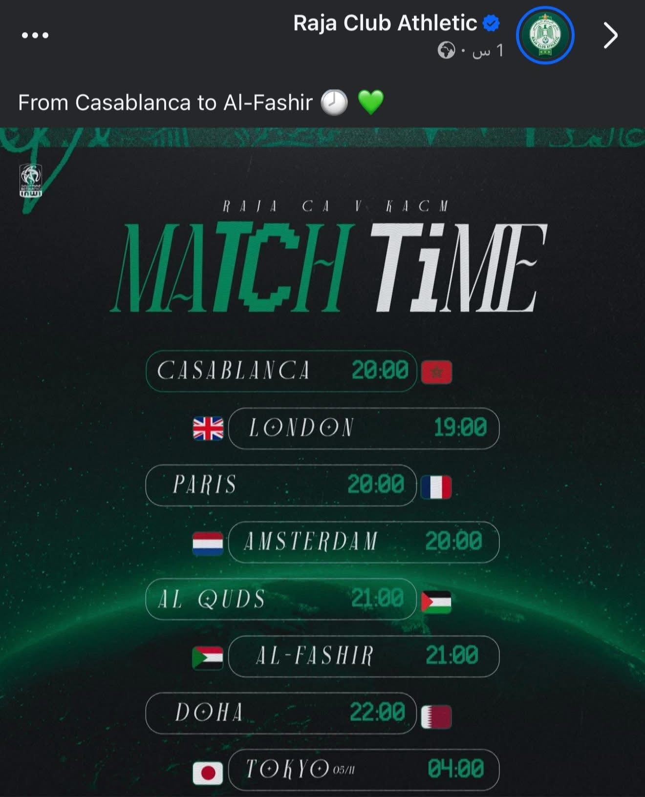 نادي الرجاء المغربي يتضامن مع الفاشر بنشر توقيت مباراته على التوقيت المحلي للمدينة